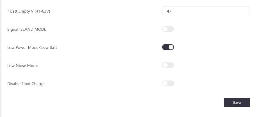 With this setting enabled, when the battery SOC falls below the “Low Batt” threshold (in the Battery Settings menu) and there is no PV generation the inverter will switch to Low Power Mode.