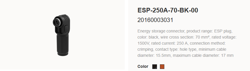 | 10000219 | ESP-250A-70-BK-00 | PP-143 | Batt 10.6kWh Connector 70mm² Negative |
