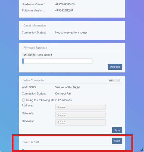 To search for local WiFi networks you navigate down to the WLAN Connection section and press the Scan button, highlighted at the bottom of the below screenshot.